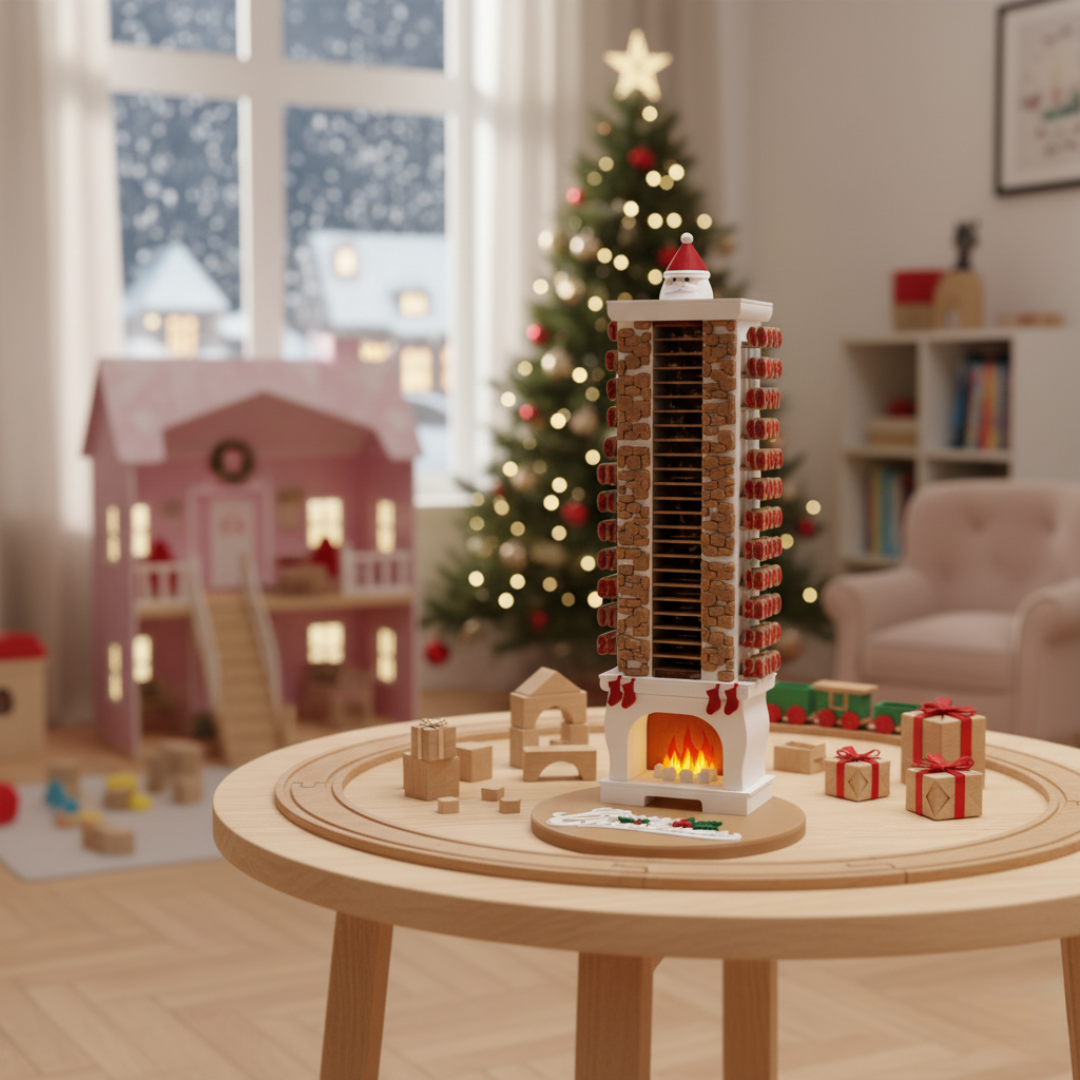 Unlike traditional calendars where you open a door, here you interact with the architecture. The chimney is built from 24 individual numbered bricks. Each day, you remove one brick from the stack. As the bricks disappear, Santa physically drops down the chimney, getting closer and closer to the fireplace ready for Christmas Eve.